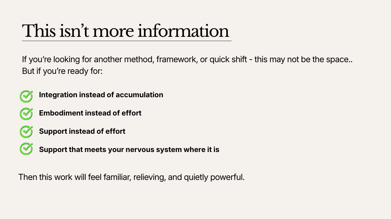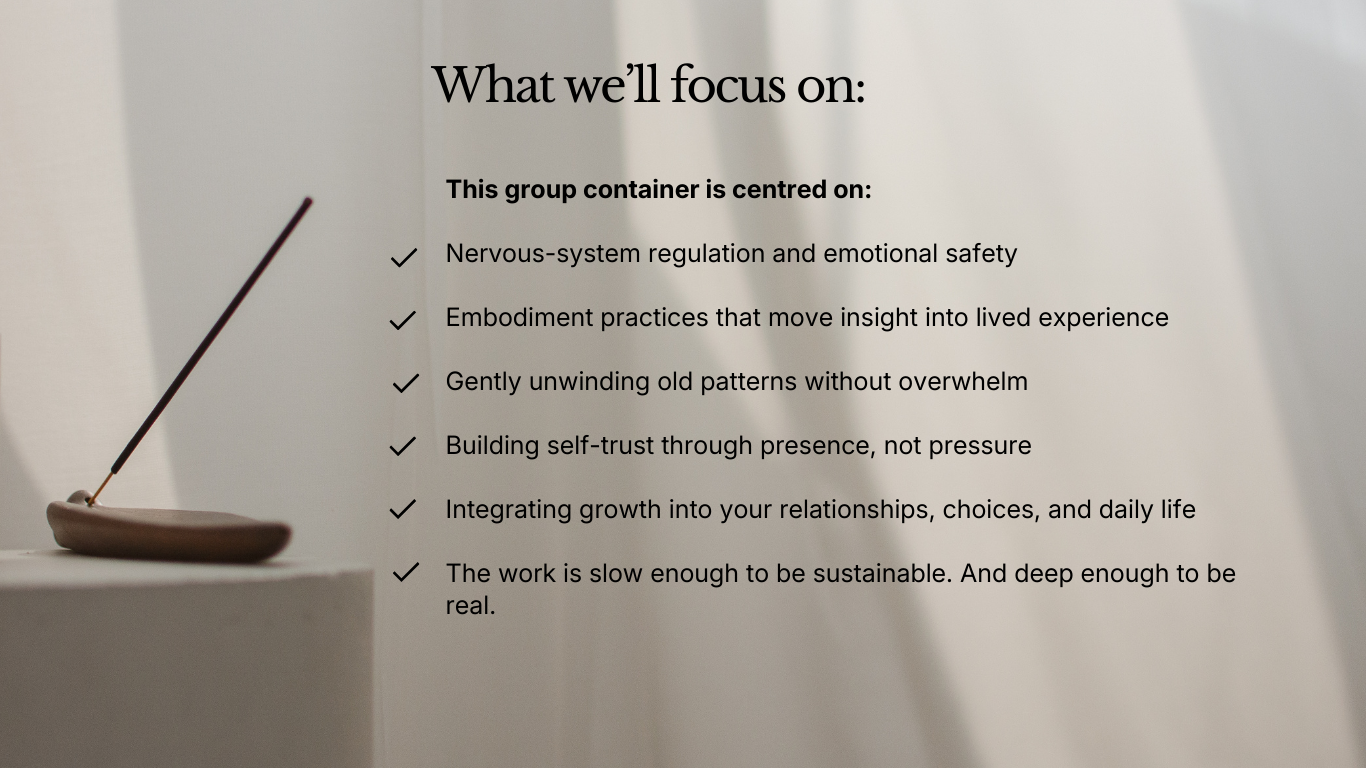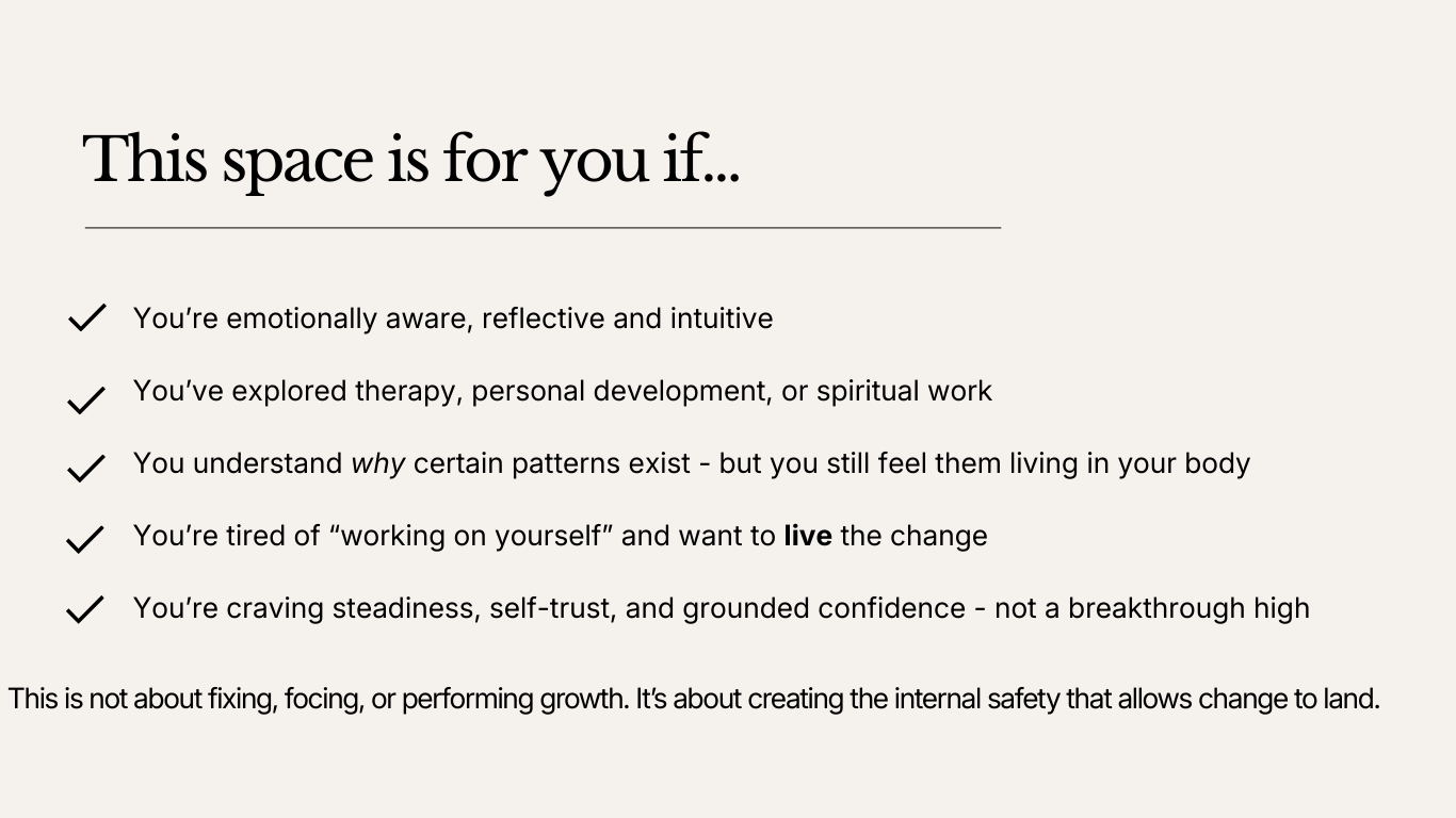 This group container is for self-aware, heart-led women who have already done their inner work and are ready to integrate it - gently, safely, and in real life. Join the waitlist for more details.